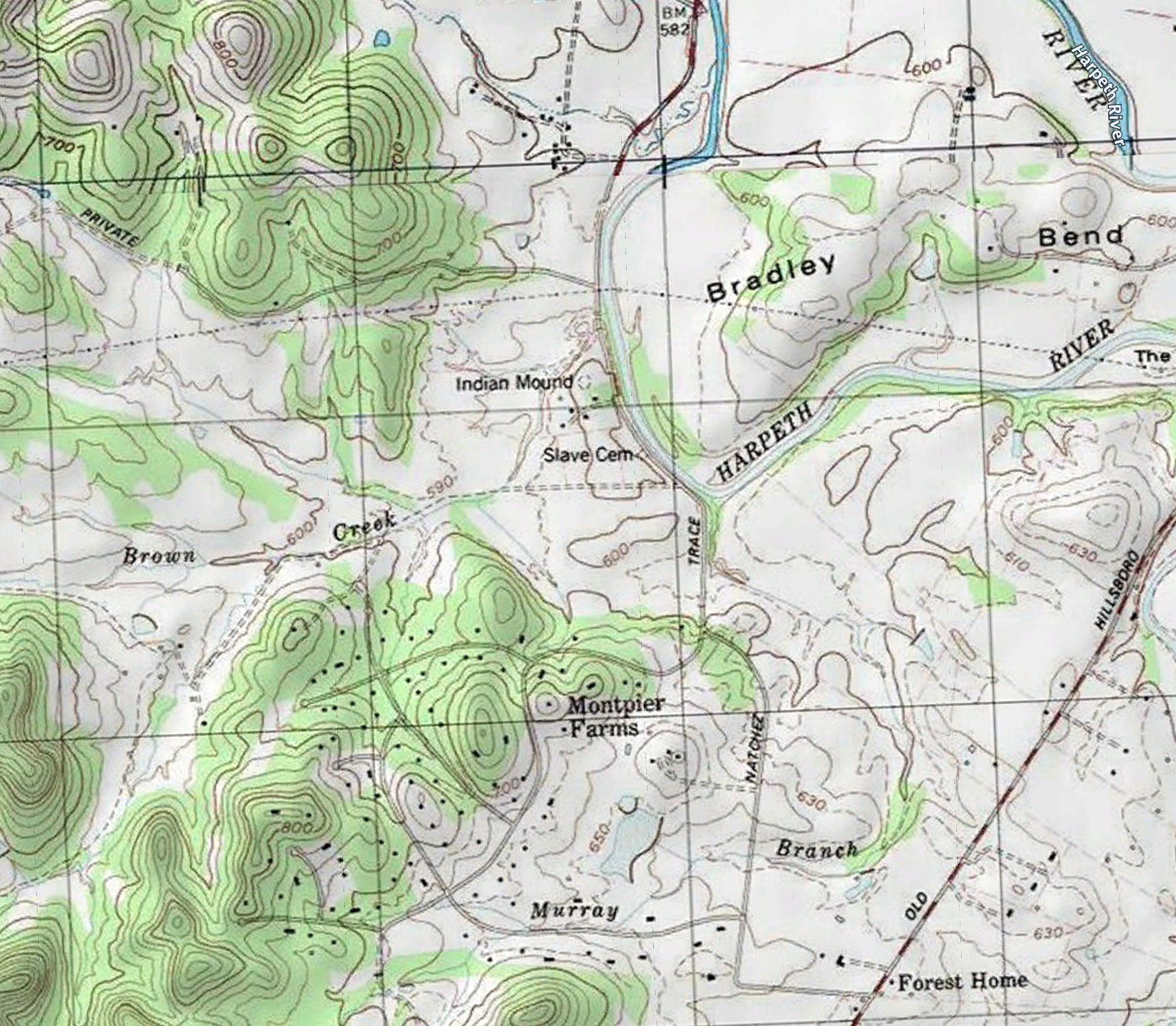 Old Town is indicated on this 1985 USGS Topographic Map by the location of “Indian Mound” near the confluence of Brown Creek and Harpeth River. Old Hillsboro Road, shown on the right of the map was historically the Great South Buffalo Road in the 1780-90s.