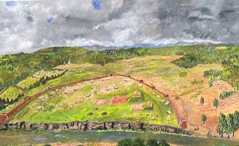 Nick Fielder painting depicting Old Town, a Mississippian-era Native American village as it may have appeared ca. 1300.