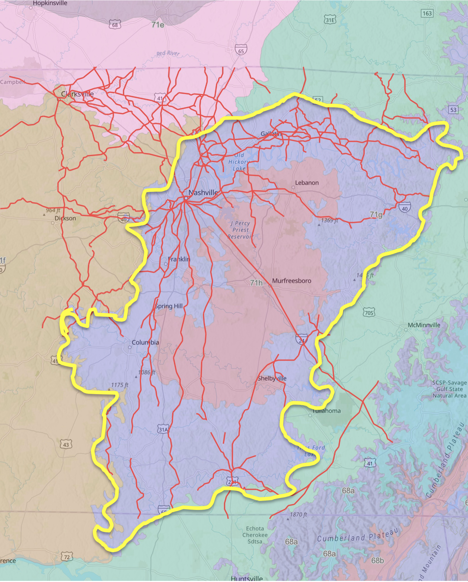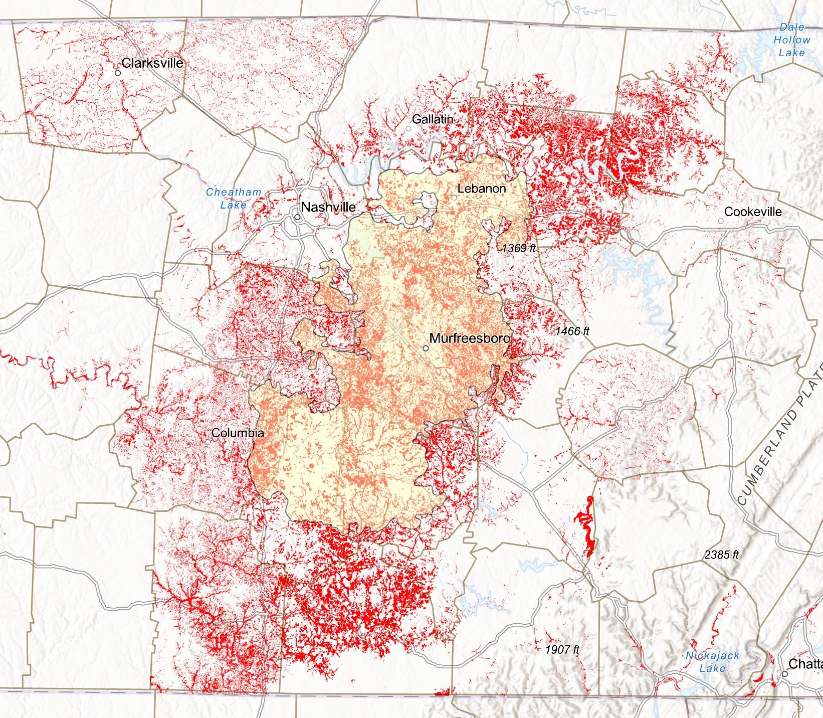 Map of central Tennessee showing distribution of Mollisol soils (grassland soils), in red, which are abundant in stream valleys and on stream terraces in the Nashville Basin Ecoregion.