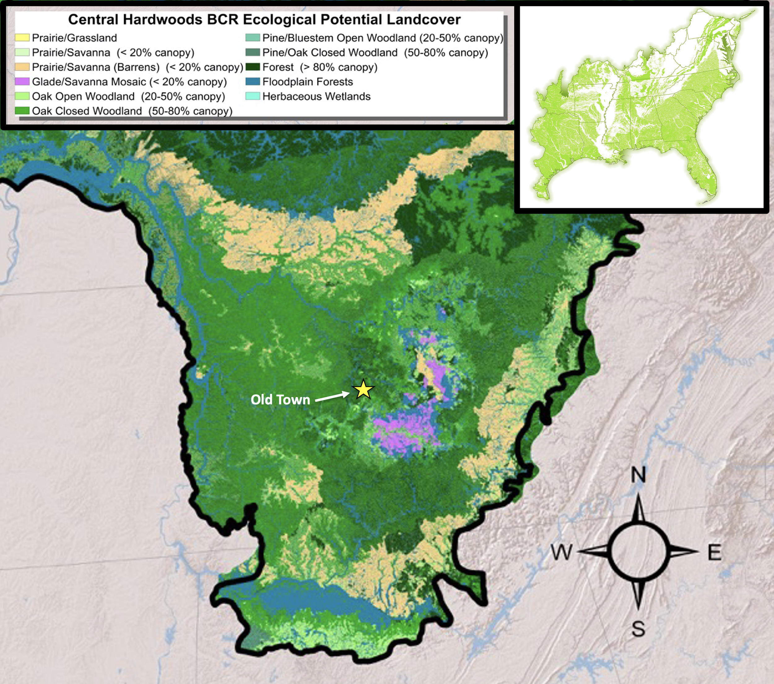 The map above by the Central Hardwoods Joint Venture shows the diversity of major ecosystems that would have been present in central Tennessee prior to European settlement as produced by landscape ecosystem modeling. According to the legend (upper left), a mosaic of ecosystems dominated the Harpeth River Valley. Forest (>80% canopy) and Oak Closed Woodland (50-80% canopy) occupied knobs and hills. Rolling low hills, terraces, and valleys were dominated by Oak Open Woodland (20-50% canopy), also known as Oak Savanna. Floodplain Forests (and associated woodlands) were found along major streams like the Harpeth River. Glade/Savanna Mosaic (<20% canopy) and Prairie/Savanna (<20% canopy) occupied large areas of the Nashville Basin Ecoregion. The inset map in upper right shows the 24-state Southeastern Grasslands Institute focal region with areas in green showing areas that included significant open, grassy ecosystems such as savannas, prairies, meadows, and open grassy woodlands.
