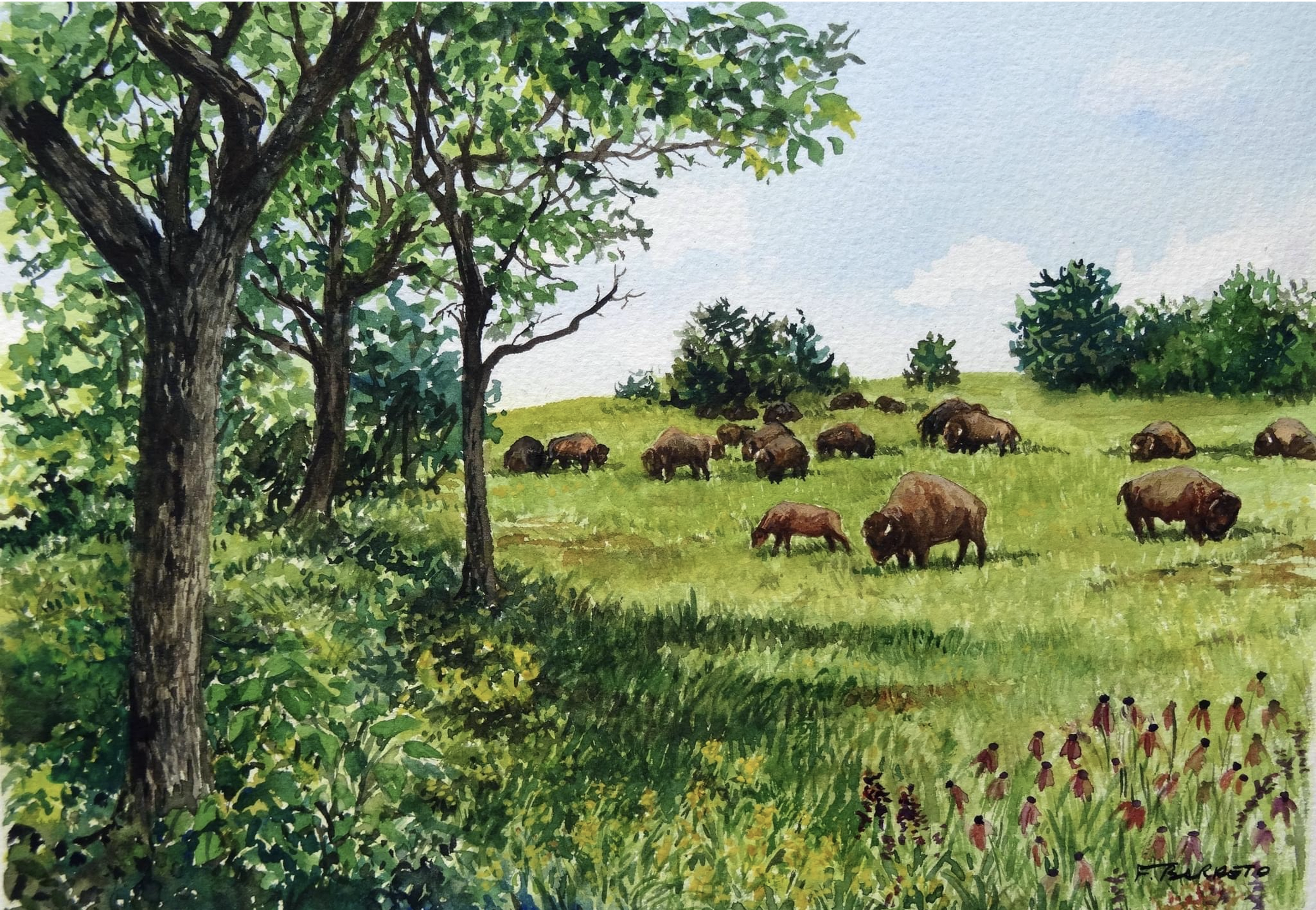 Painting depicting the historical bison meadows of the Nashville Basin that would have been similar to those found near Old Town in the mid-late 1700s. Painting by: Flávia F. Barreto for Artists & Biologists Unite for Nature (ABUN).
